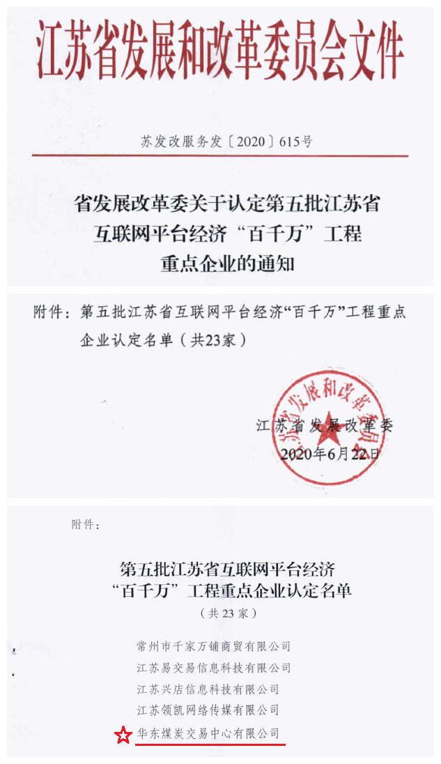 為貫徹落實(shí)《省政府關(guān)于加快發(fā)展互聯(lián)網(wǎng)平臺(tái)經(jīng)濟(jì)發(fā)展的指導(dǎo)意見(jiàn)》(蘇發(fā)〔2015〕40號(hào))文件精神,加快實(shí)施互聯(lián)網(wǎng)平臺(tái)經(jīng)濟(jì)“百千萬(wàn)”工程,經(jīng)省級(jí)主管部門(mén)審核、專家評(píng)審及網(wǎng)上公示等程序,根據(jù)江蘇省發(fā)展和改革委員會(huì)印發(fā)的《省發(fā)展改革委關(guān)于認(rèn)定第五批江蘇省互聯(lián)網(wǎng)平臺(tái)經(jīng)濟(jì)“百千萬(wàn)”工程重點(diǎn)企業(yè)通知》(蘇發(fā)改服務(wù)發(fā)〔2020〕615號(hào))文件,認(rèn)定華東煤炭交易中心有限公司為第五批江蘇省互聯(lián)網(wǎng)平臺(tái)經(jīng)濟(jì)“百千萬(wàn)”工程重點(diǎn)企業(yè)。